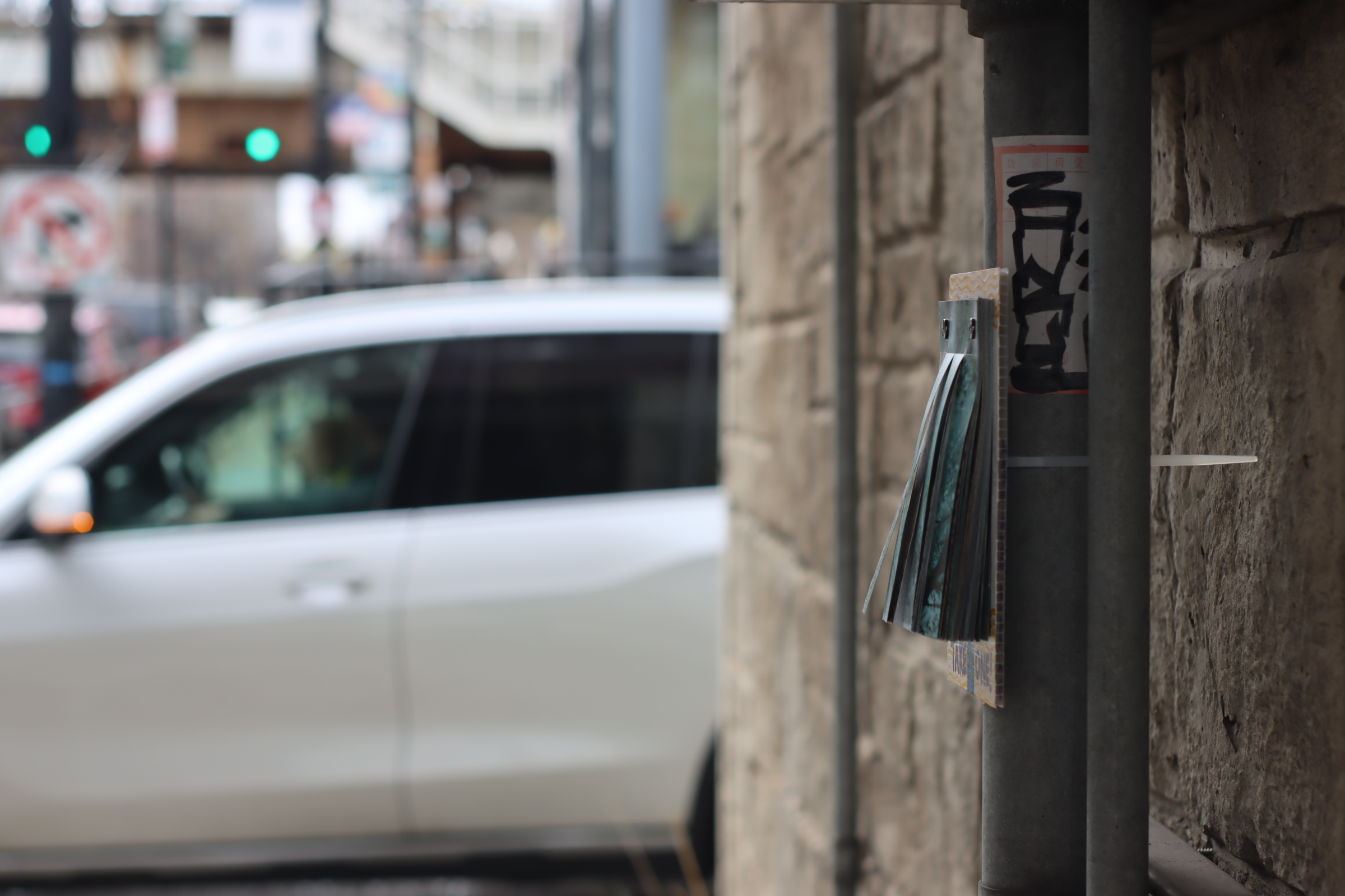 As passers-by take tabs, they’ll combine bits and pieces of various images in new ways, juxtaposing the many colors and patterns of the original images. I carefully cut out pages from the books so that there are photos on both sides. I also played with odd and awkward cropping to put familiar animals in new contexts. I’m glad to have given these books a second life as an art project, rather than simply recycling them.